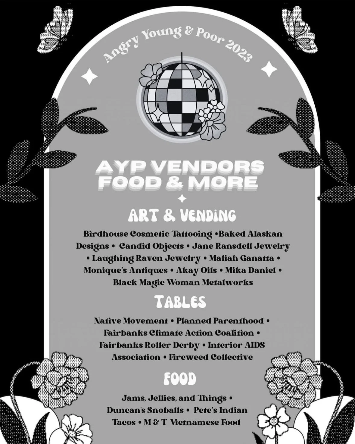 Angry Young & Poor a free, all ages, anti-capitalist music festival in Ester, Alaska. “Angry Young and Poor rocked Ester yet again” -Fairbanks Daily News-Miner, Aug 2023 EVENT FLYER AMBLER ROAD X AYP LINE UP GRAPHIC FUNDRAISER GRAPHIC ESTER DOME GRAPHIC SPONORS GRAPHIC VENDORS GRAPHIC ANGRY GRAPHIC